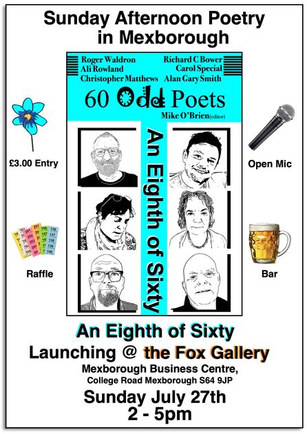Join a Sunday afternoon of poetry in Mexborough with '60 Odd Poets', featuring Mike O’Brien and others. The event includes an open mic, a raffle, and a bar. Entry is £3, and it's happening at The Fox Gallery in the Mexborough Business Centre.