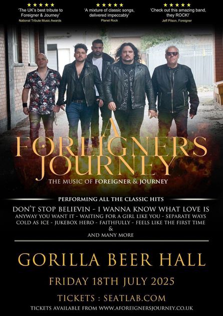 A Foreigner's Journey, the UK's best tribute to Foreigner & Journey, is performing live at the Gorilla Beer Hall on Friday, 18th July 2025. Enjoy all the classic hits such as 'Don't Stop Believin', 'I Wanna Know What Love Is', and many more. Tickets are available through Seatlab and their official website.