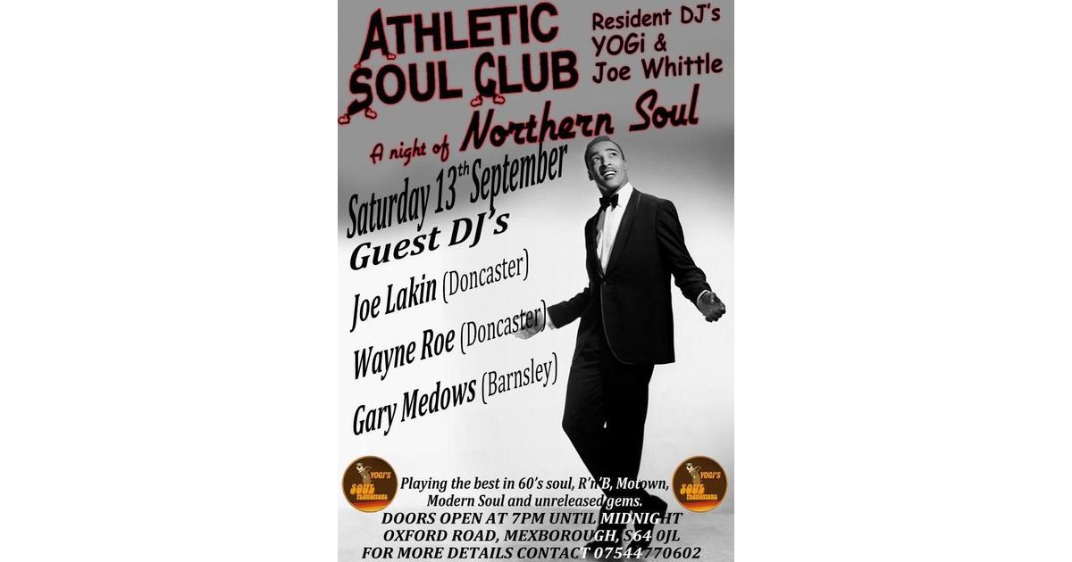 Experience an electrifying night of Northern Soul with resident DJs Yogi and Joe Whittle at the Athletic Soul Club. Featuring guest DJs Joe Lakin, Wayne Roe, and Gary Medows, this event promises a thrilling blend of 60's soul, R'n'B, Motown, and modern soul tracks along with unreleased gems. Located on Oxford Road in Mexborough, this night promises to keep you dancing from 7 PM until midnight.
