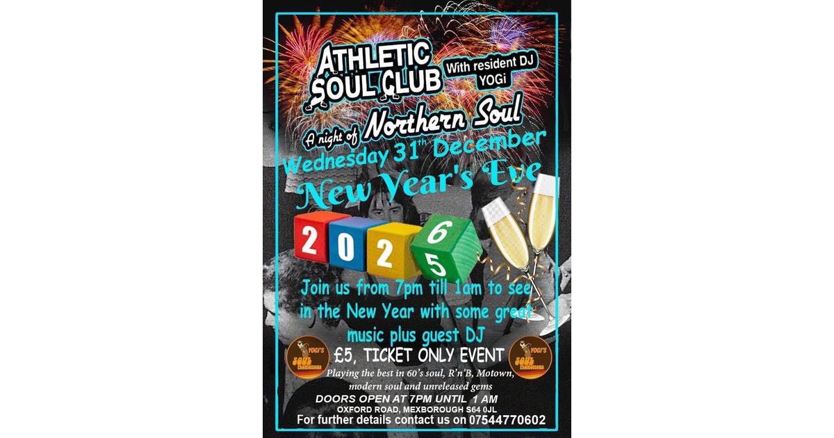 Celebrate New Year's Eve with the Athletic Soul Club at Yoor's Soul Club in Mexborough. Enjoy a night of Northern Soul with resident DJ Yogi and a guest DJ, spinning the best in 60's soul, R'n'B, Motown, and unreleased gems. It's a ticket-only event with doors opening at 7 pm until 1 am.