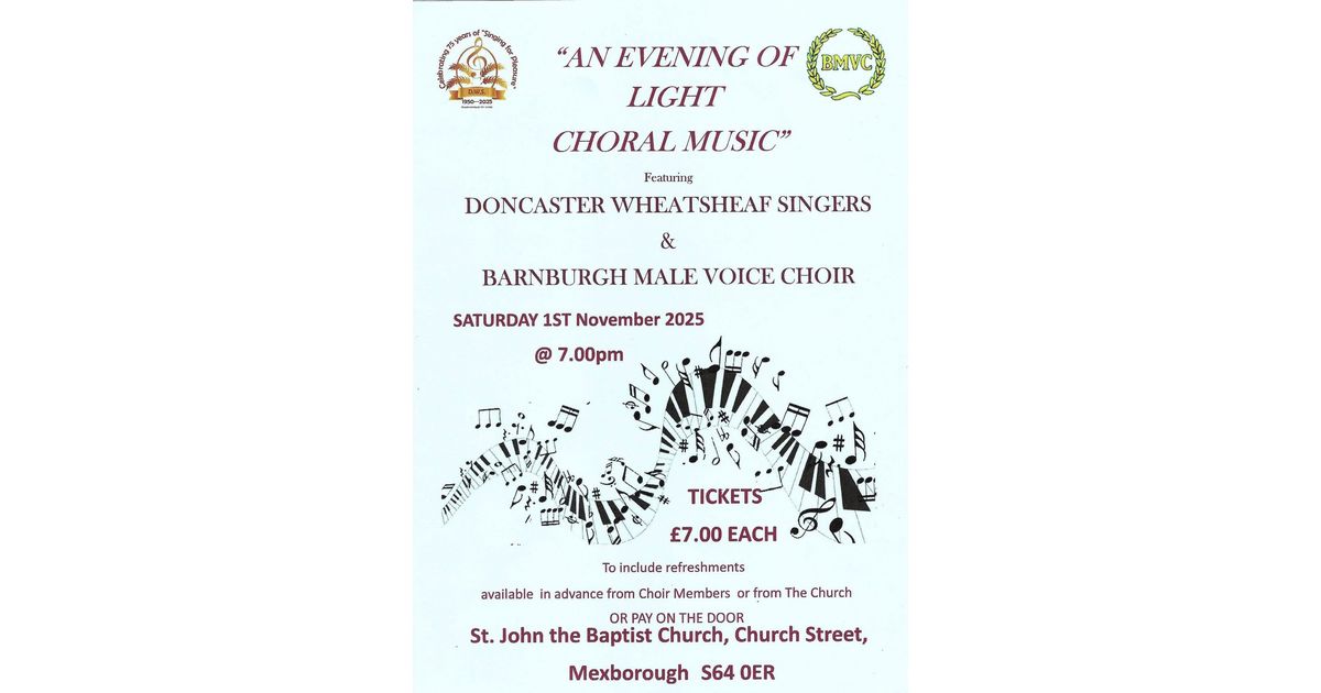Join the Doncaster Wheatsheaf Singers and Barnburgh Male Voice Choir for an enchanting evening of light choral music. The event takes place at St. John the Baptist Church in Mexborough. Tickets are priced at £7 each, available in advance from choir members or the church, and can also be purchased at the door. Attendees can enjoy refreshments included with the ticket.