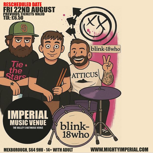 Join blink-18who for a rescheduled concert on Friday, 22nd August at the Imperial Music Venue in Mexborough. Previous tickets are valid for this exciting event suitable for those 14 and up with an adult. Tickets are priced at £6.50.