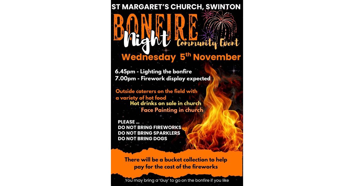 Join the community for an exciting Bonfire Night at St Margaret's Church in Swinton. The event features bonfire lighting at 6:45 PM followed by a spectacular fireworks display at 7:00 PM. Enjoy a variety of hot food from outside caterers, hot drinks for sale inside the church, and face painting. Please refrain from bringing your own fireworks, sparklers, or dogs. A bucket collection will take place to support fireworks costs. Bring a 'Guy' to place on the bonfire if you like.