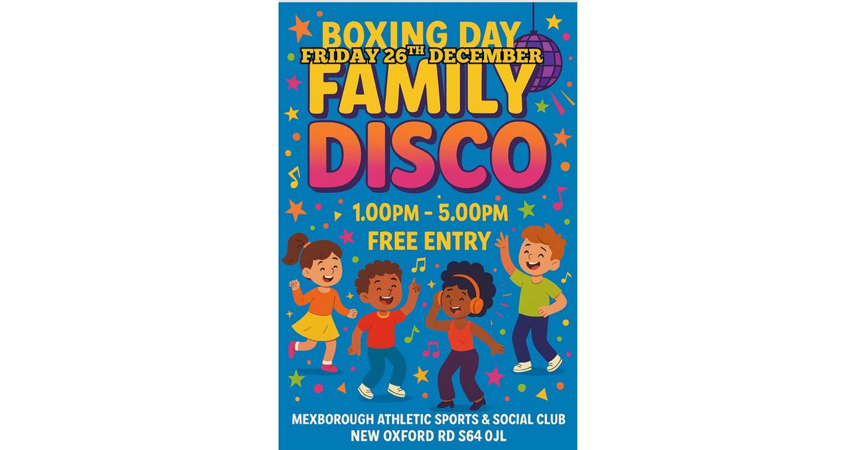 Join the Boxing Day Family Disco at Mexborough Athletic Sports & Social Club, featuring fun and dancing for all ages. Enjoy a lively environment with free entry on December 26th. A perfect way to spend time with family and friends during the holiday season.