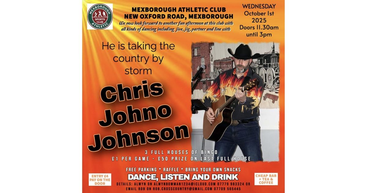 Enjoy a lively afternoon with Chris Johno Johnson at Mexborough Athletic Club. The event offers a memorable performance featuring a blend of jive, jig, partner, and line dancing. Attendees can participate in three full houses of bingo, with £1 per game and a £50 prize on the last full house. Additional features include free parking, a raffle, and the option to bring your own snacks. Refreshments are available at the cheap bar serving tea and coffee.