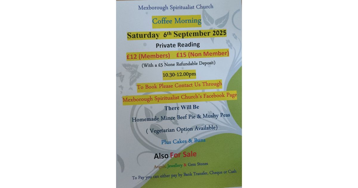 Mexborough Spiritualist Church invites you to a Coffee Morning on Saturday, 6th September 2025. Enjoy a private reading with delicious homemade mince beef pie and mushy peas, including a vegetarian option, plus cakes and buns. Additional items like angels, jewellery, and gemstones will be for sale. Booking is available through the church's Facebook page.