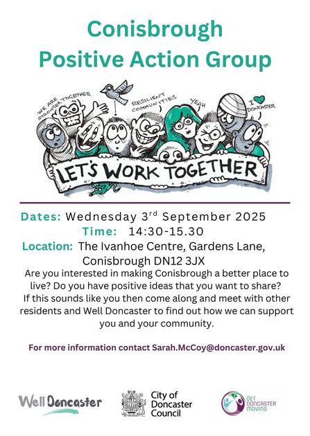 The Conisbrough Positive Action Group event invites locals to 'work together' to make Conisbrough a better place to live. Participants will have the opportunity to meet with other residents and Well Doncaster to share positive ideas and find out how they can be supported by the community. Join the event at The Ivanhoe Centre on Wednesday, 3rd September 2025, from 14:30 to 15:30.