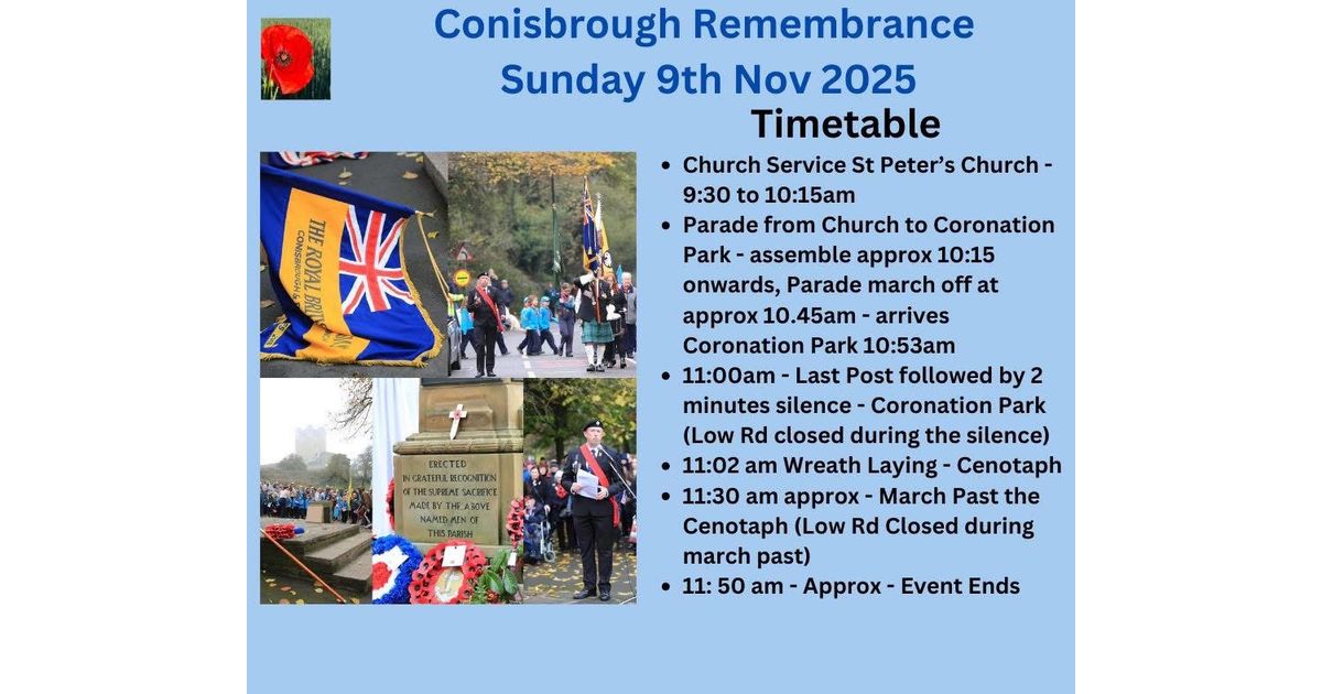 Join the Conisbrough Remembrance on Sunday, 9th November 2025. The event begins with a Church Service at St Peter’s Church from 9:30 to 10:15 am, followed by a parade to Coronation Park. Experience the solemn Last Post and a two-minute silence, concluding with a wreath laying at the Cenotaph. Traffic on Low Rd will be closed during the event.