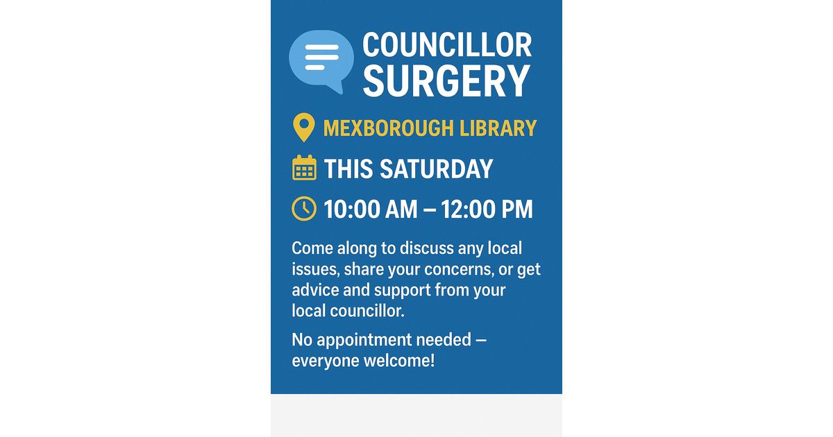 Attend the Councillor Surgery at Mexborough Library to discuss any local issues, share your concerns, or get advice and support from your local councillor. No appointment needed—everyone welcome!