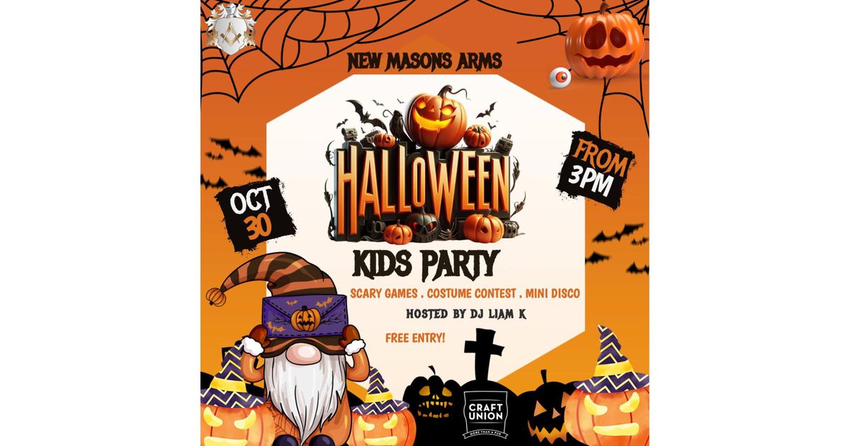 Join the Halloween Kids Party at New Masons Arms, featuring scary games, a costume contest, and a mini disco. Hosted by DJ Liam K, it's a fun-filled day for children. Free entry for all, making it the perfect family outing this Halloween.