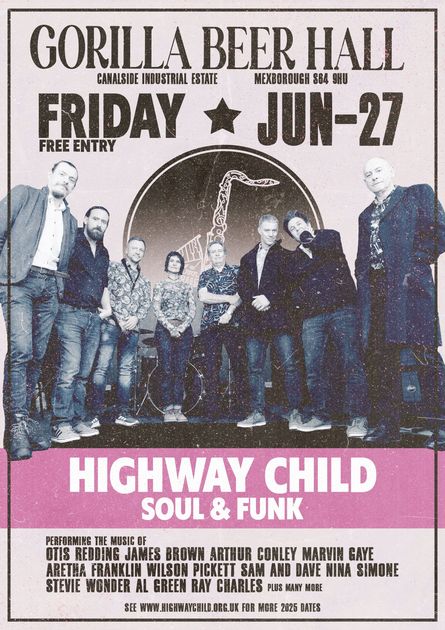 Highway Child brings a lively night of soul and funk to the Gorilla Beer Hall. Enjoy music from legends like Otis Redding, James Brown, and Marvin Gaye. Free entry for an exciting Friday evening.