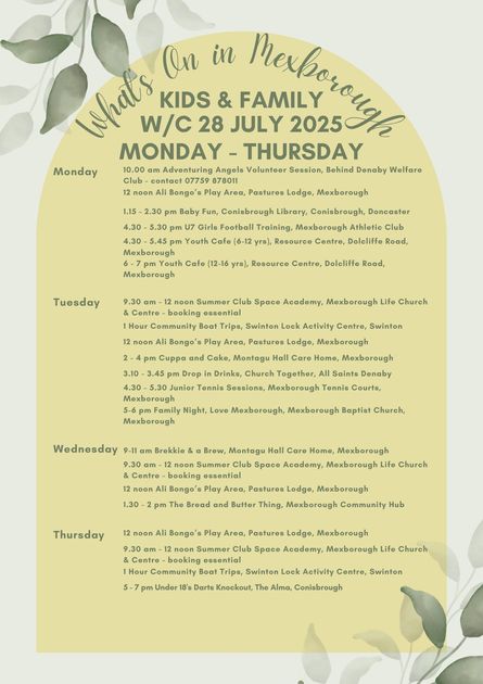 A week of engaging kids and family activities happening across Mexborough from Monday to Thursday. Highlights include Baby Fun at Conisbrough Library, Girls Football Training at Mexborough Athletic Club, and Youth Cafe at Resource Centre. Families can also enjoy a Community Bus Trip from Swinton or participate in sessions at Pastures Lodge.