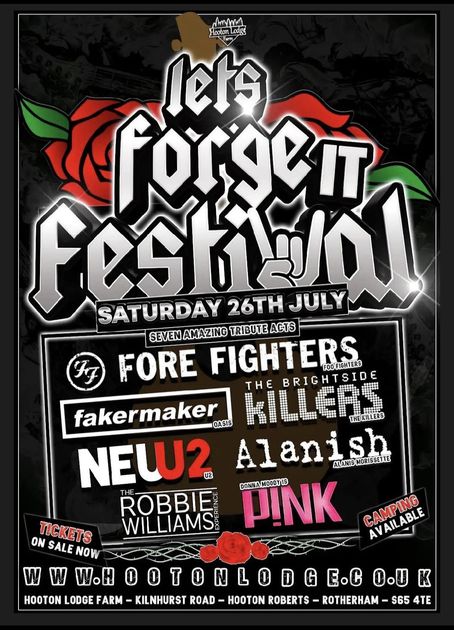 Let's Forge It Festival features seven amazing tribute acts, including the Fore Fighters, Fakermaker, The Brightside Killers, and others. The event takes place at Hooton Lodge Farm with camping available. Tickets are on sale now. Visit www.hootonlodge.co.uk for more details.