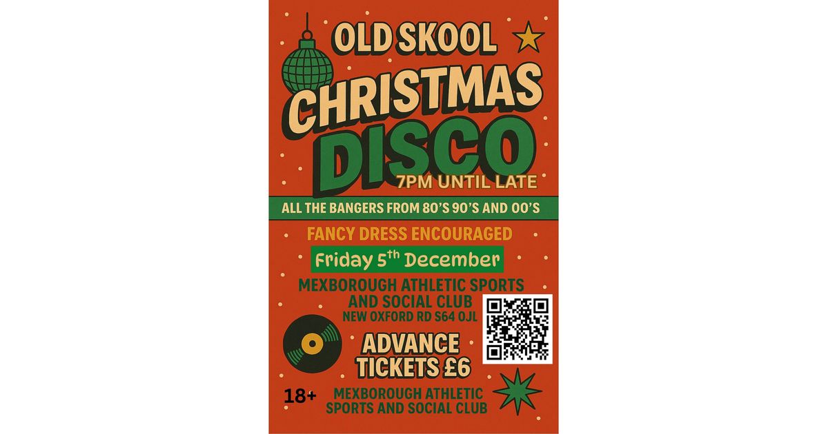 Join the Old Skool Christmas Disco for a night of classic tunes from the 80s, 90s, and 00s. Fancy dress is encouraged as you dance the night away at Mexborough Athletic Sports and Social Club. Secure your advance tickets for just £6.
