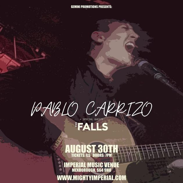 Gemini Promotions presents a dynamic performance by Pablo Carrizo with special guests The Falls. The event takes place at the Imperial Music Venue in Mexborough. Doors open at 7 PM. Tickets are priced at £5.