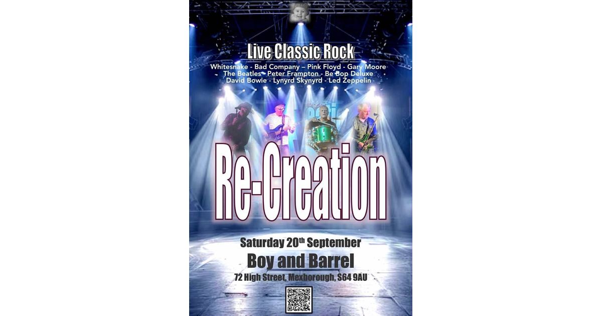 Enjoy a night of live classic rock with Re-Creation at the Boy and Barrel in Mexborough. Featuring music from legendary bands such as Whitesnake, Bad Company, Pink Floyd, and more, this event promises a thrilling tribute to rock legends.