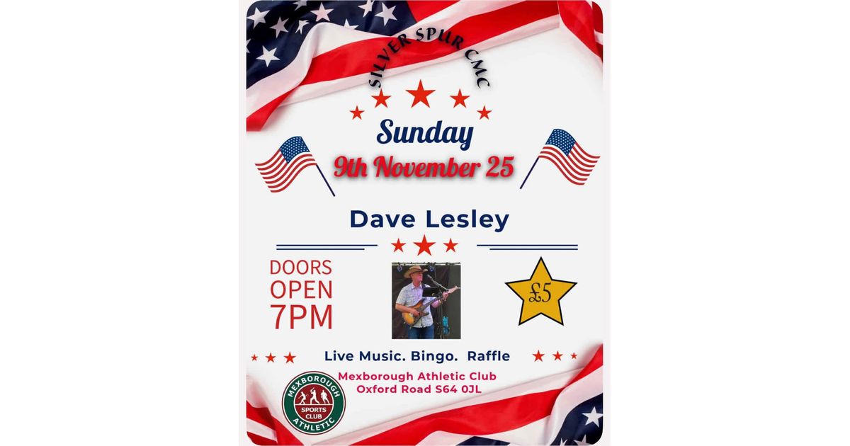 Join the Silver Spur CMC for an evening of live music featuring Dave Lesley at the Mexborough Athletic Club. Enjoy live performances, bingo, and a raffle. Doors open at 7 PM. A fun-filled event for music lovers.